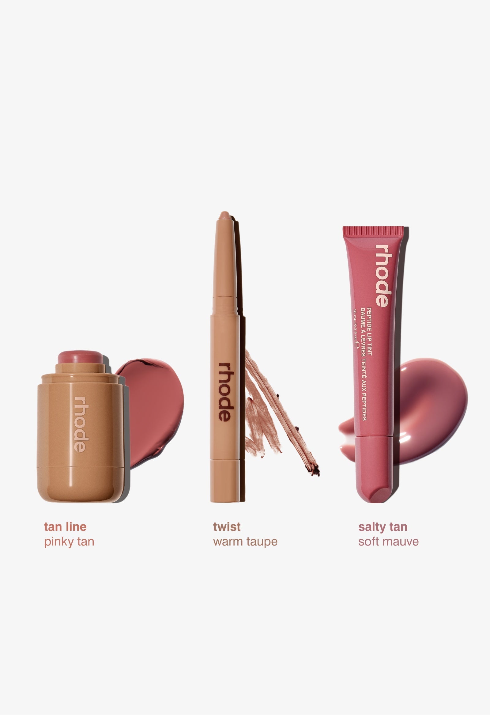 Includes 3 full size products: Pocket Blush in Tan Line, Peptide Lip Shape in Twist, and Peptide Lip Tint in Salty Tan.